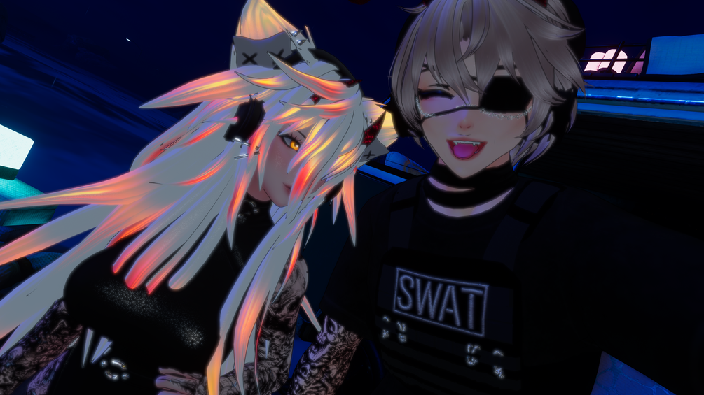 Hello! Finally made another matching avatar, his name is Byte~ with the matching avatar being Tera~! Word play on Terabyte :) Went for a bit of an edgy/sadistic Classified theme! They are both pretty great looking in game, super good for dancing or chillin if that's your vibe. He's got more of a chill look compared to the both of them but they look dope together! Hope ya'll enjoy! :)